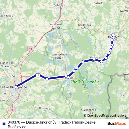 The first stop of the 340370 bus route is Dačice,aut.nádr. and the last stop is České Budějovice,U soudu. 340370 (Dačice-Jindřichův Hradec-Třeboň-České Budějovice) is operational during everyday.