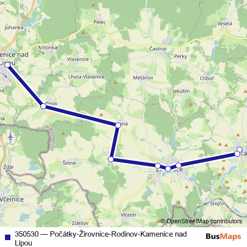 The first stop of the 350530 bus route is Počátky, autobusové nádraží and the last stop is Kamenice nad Lipou, autobusové nádraží. 350530 (Počátky-Žirovnice-Rodinov-Kamenice nad Lipou) is operational during everyday.