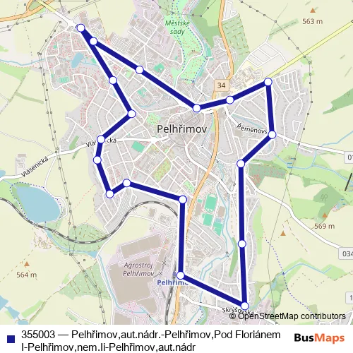 Bus 355003 - Pelhřimov,aut.nádr.-Pelhřimov,Pod Floriánem I-Pelhřimov,nem.Ii-Pelhřimov,aut.nádr in Pelhrimov: Stops & Timetable