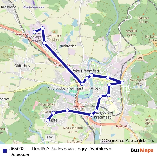 The first stop of the 365003 bus route is Písek,Hradiště and the last stop is Písek,Dobešice. 365003 (Hradiště-Budovcova-Logry-Dvořákova-Dobešice) is operational during everyday.