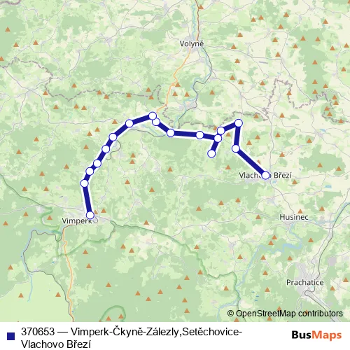 The first stop of the 370653 bus route is Vlachovo Březí and the last stop is Vimperk,aut.nádr.. 370653 (Vimperk-Čkyně-Zálezly,Setěchovice-Vlachovo Březí) is operational during on weekdays.