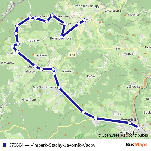 The first stop of the 370664 bus route is Vimperk,aut.nádr. and the last stop is Vacov,aut.st.. 370664 (Vimperk-Stachy-Javorník-Vacov) is operational during on weekdays.
