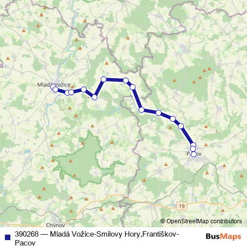 The first stop of the 390268 bus route is Mladá Vožice, autobusové stanoviště and the last stop is Pacov, autobusové nádraží. 390268 (Mladá Vožice-Smilovy Hory,Františkov-Pacov) is operational during on weekends.