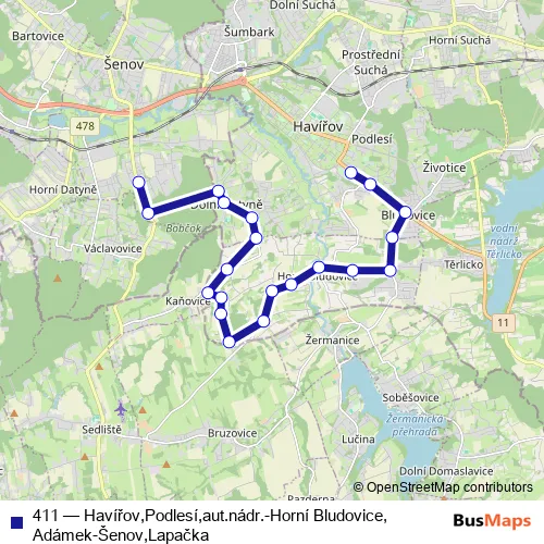 The first stop of the 411 bus route is Šenov, Lapačka and the last stop is Havířov, Podlesí, autobusové nádraží. 411 (Havířov,Podlesí,aut.nádr.-Horní Bludovice,Adámek-Šenov,Lapačka) is operational during everyday.