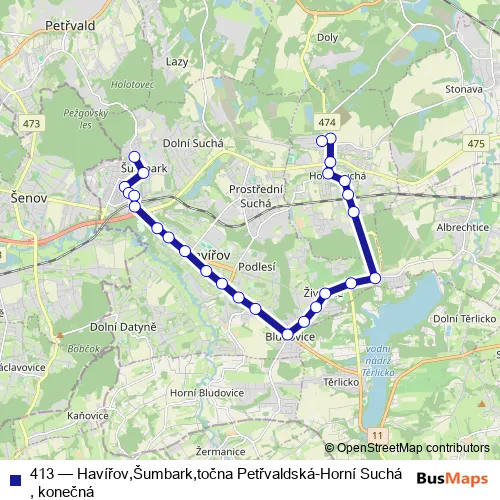 The first stop of the 413 bus route is Havířov, Šumbark, točna Petřvaldská and the last stop is Horní Suchá, konečná. 413 (Havířov,Šumbark,točna Petřvaldská-Horní Suchá, konečná) is operational during everyday.