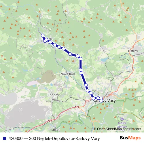 The first stop of the 420300 bus route is Nejdek,Metalis and the last stop is Karlovy Vary,terminál. 420300 (300 Nejdek-Děpoltovice-Karlovy Vary) is operational during everyday.