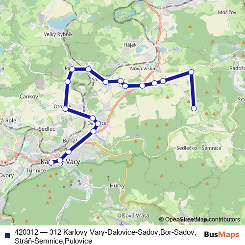 The first stop of the 420312 bus route is Karlovy Vary,terminál and the last stop is Šemnice,Pulovice. 420312 (312 Karlovy Vary-Dalovice-Sadov,Bor-Sadov,Stráň-Šemnice,Pulovice) is operational during on weekdays.
