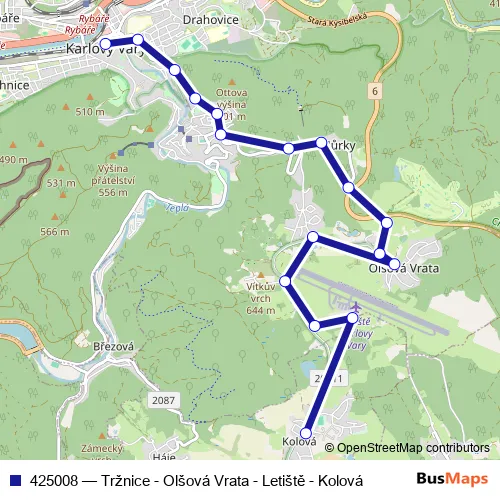 The first stop of the 425008 bus route is Kolová,Obú and the last stop is Karlovy Vary,Tržnice. 425008 (Tržnice - Olšová Vrata - Letiště - Kolová) is operational during everyday.