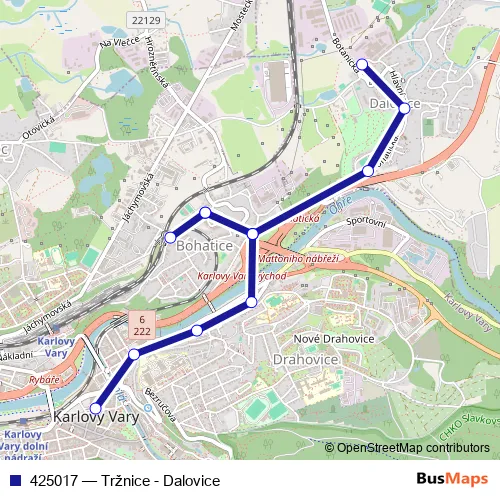 The first stop of the 425017 bus route is Dalovice and the last stop is Karlovy Vary,Tržnice. 425017 (Tržnice - Dalovice) is operational during everyday.