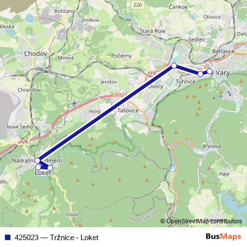 The first stop of the 425023 bus route is Karlovy Vary,Tržnice and the last stop is Loket. 425023 (Tržnice - Loket) is operational during on weekends.