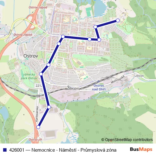 The first stop of the 426001 bus route is Ostrov, Průmyslová zóna Ii and the last stop is Ostrov, nemocnice. 426001 (Nemocnice - Náměstí - Průmyslová zóna) is operational during everyday.