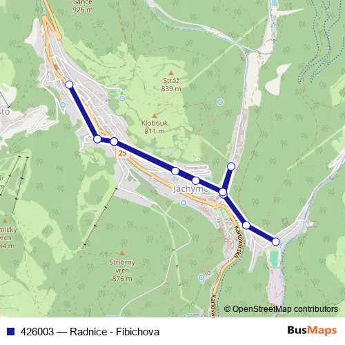 The first stop of the 426003 bus route is Jáchymov,Fibichova and the last stop is Jáchymov,Škola. 426003 (Radnice - Fibichova) is operational during on weekdays.