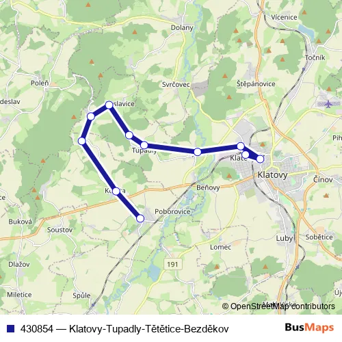The first stop of the 430854 bus route is Bezděkov and the last stop is Klatovy,aut.nádr.. 430854 (Klatovy-Tupadly-Tětětice-Bezděkov) is operational during on weekdays.