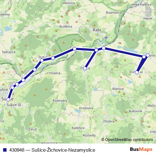 The first stop of the 430948 bus route is Sušice,nábřeží and the last stop is Nezamyslice. 430948 (Sušice-Žichovice-Nezamyslice) is operational during on weekdays.