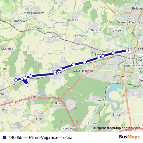 The first stop of the 440055 bus route is Plzeň,Can and the last stop is Tlučná,konečná. 440055 (Plzeň-Vejprnice-Tlučná) is operational during everyday.