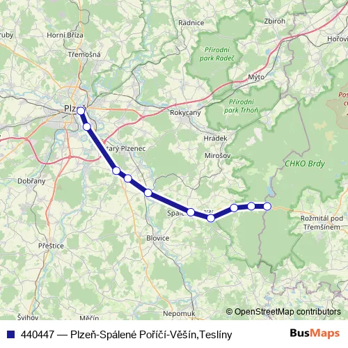 The first stop of the 440447 bus route is Plzeň,Terminál Hlavní nádraží and the last stop is Věšín,Teslíny. 440447 (Plzeň-Spálené Poříčí-Věšín,Teslíny) is operational during on weekends.