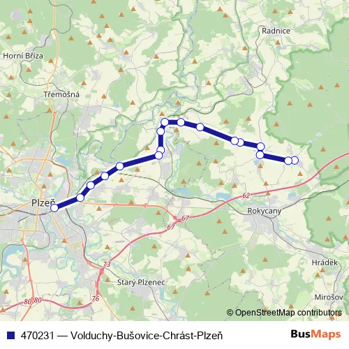 The first stop of the 470231 bus route is Plzeň,Terminál Hlavní nádraží and the last stop is Volduchy. 470231 (Volduchy-Bušovice-Chrást-Plzeň) is operational during everyday.