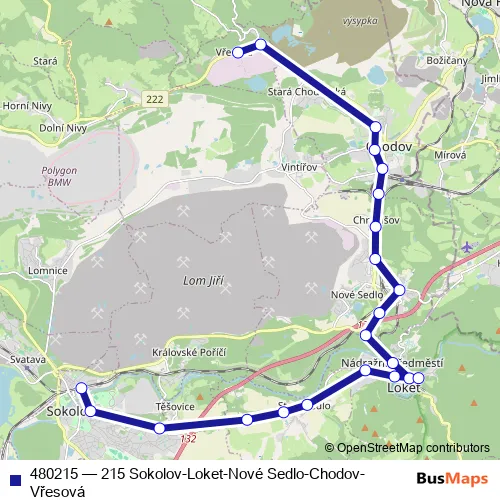 The first stop of the 480215 bus route is Chodov,aut.nádr. and the last stop is Sokolov,Terminál. 480215 (215 Sokolov-Loket-Nové Sedlo-Chodov-Vřesová) is operational during on weekdays.