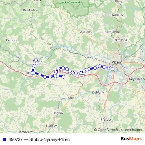 The first stop of the 490737 bus route is Plzeň,Bory and the last stop is Stříbro,aut.st.. 490737 (Stříbro-Nýřany-Plzeň) is operational during everyday.