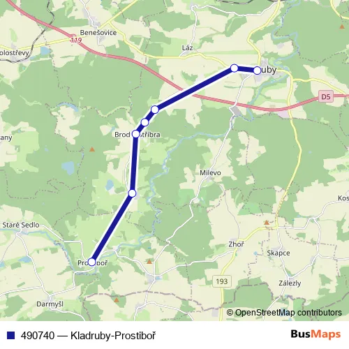 The first stop of the 490740 bus route is Kladruby,Zadní and the last stop is Prostiboř. 490740 (Kladruby-Prostiboř) is operational during on weekdays.