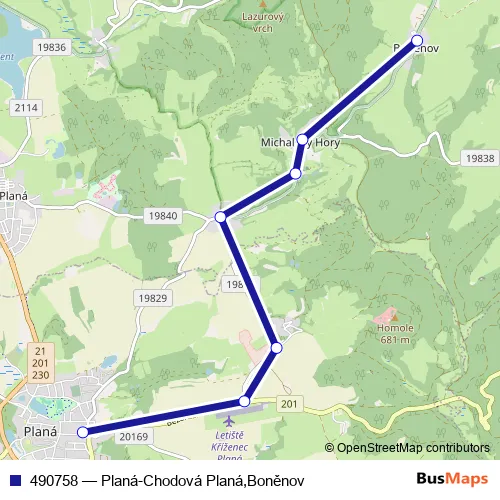 The first stop of the 490758 bus route is Chodová Planá,Boněnov and the last stop is Planá,aut.st.. 490758 (Planá-Chodová Planá,Boněnov) is operational during on weekdays.