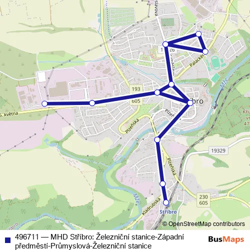 The first stop of the 496711 bus route is Stříbro,žel.st. and the last stop is Stříbro,žel.st.. 496711 (MHD Stříbro: Železniční stanice-Západní předměstí-Průmyslová-Železniční stanice) is operational during everyday.