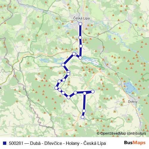 The first stop of the 500281 bus route is Česká Lípa,aut.nádr. and the last stop is Dubá,aut.nádr.. 500281 (Dubá - Dřevčice - Holany - Česká Lípa) is operational during on weekdays.