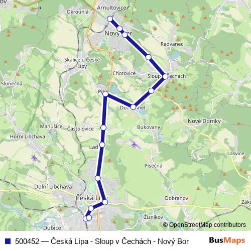 The first stop of the 500452 bus route is Nový Bor,aut.nádr. and the last stop is Česká Lípa,aut.nádr.. 500452 (Česká Lípa - Sloup v Čechách - Nový Bor) is operational during on weekends.