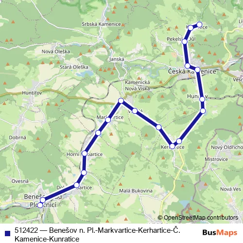 The first stop of the 512422 bus route is Benešov n.Pl.,žel.st. and the last stop is Kunratice,horní. 512422 (Benešov n. Pl.-Markvartice-Kerhartice-Č. Kamenice-Kunratice) is operational during on weekdays.