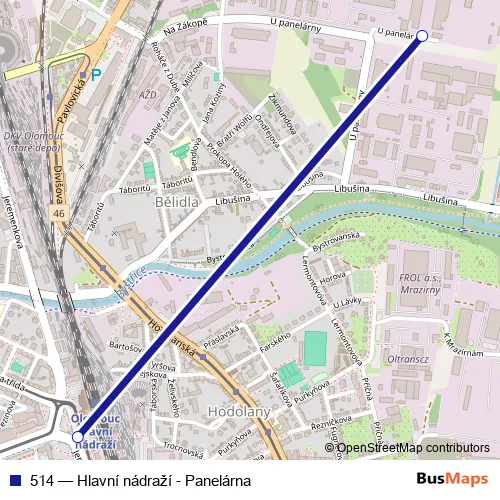 The first stop of the 514 bus route is Olomouc, hl. nádr. and the last stop is Olomouc, Panelárna. 514 (Hlavní nádraží - Panelárna) is operational during everyday.