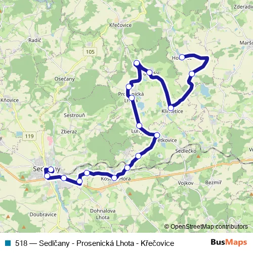 The first stop of the 518 bus route is Křečovice,Hořetice and the last stop is Sedlčany,aut.st.. 518 (Sedlčany - Prosenická Lhota - Křečovice) is operational during on weekdays.