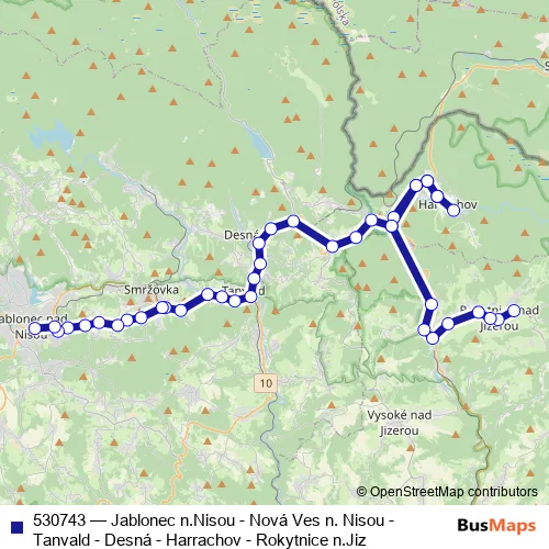 The first stop of the 530743 bus route is Harrachov,aut.nádr. and the last stop is Jablonec n.Nisou,Autobusové nádraží. 530743 (Jablonec n.Nisou - Nová Ves n. Nisou - Tanvald - Desná - Harrachov - Rokytnice n.Jiz) is operational during on weekends.