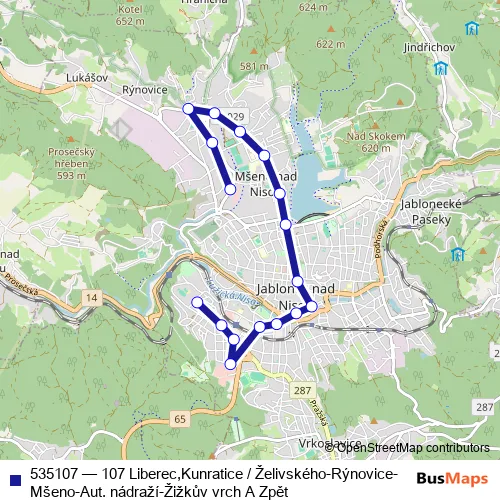 The first stop of the 535107 bus route is Jablonec n.Nisou,Rýnovice,Želivského and the last stop is Jablonec n.Nisou,Autobusové nádraží. 535107 (107 Liberec,Kunratice / Želivského-Rýnovice-Mšeno-Aut. nádraží-Žižkův vrch A Zpět) is operational during everyday.