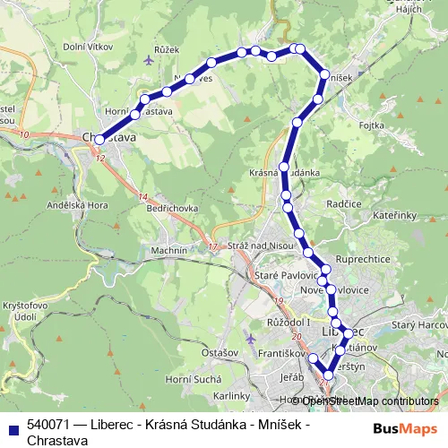 The first stop of the 540071 bus route is Chrastava,aut.nádr. and the last stop is Liberec,Fügnerova. 540071 (Liberec - Krásná Studánka - Mníšek - Chrastava) is operational during everyday.