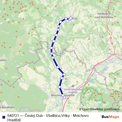 The first stop of the 540721 bus route is Mnichovo Hradiště,dopravní terminál and the last stop is Český Dub,nám.. 540721 (Český Dub - Všelibice,Vrtky - Mnichovo Hradiště) is operational during on weekdays.