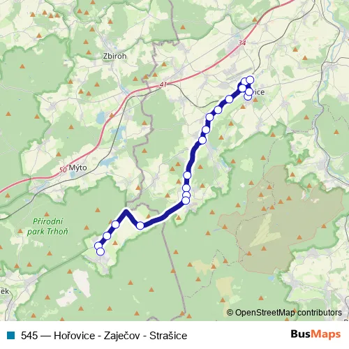 The first stop of the 545 bus route is Hořovice,nám.B.Němcové and the last stop is Strašice,Obú. 545 (Hořovice - Zaječov - Strašice) is operational during everyday.