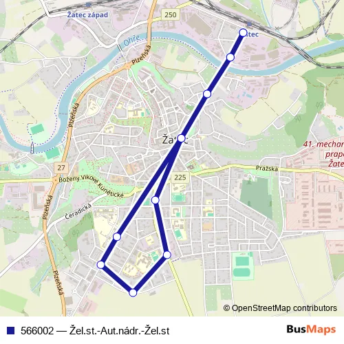 The first stop of the 566002 bus route is Žatec,žel.st. and the last stop is Žatec,žel.st.. 566002 (Žel.st.-Aut.nádr.-Žel.st) is operational during on weekdays.