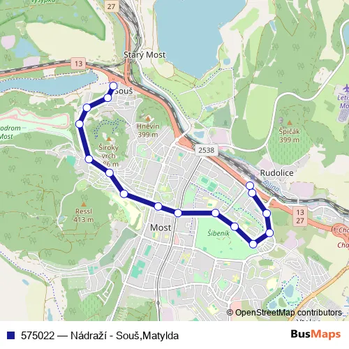 The first stop of the 575022 bus route is Most,nádraží and the last stop is Most,Souš,Matylda. 575022 (Nádraží - Souš,Matylda) is operational during everyday.