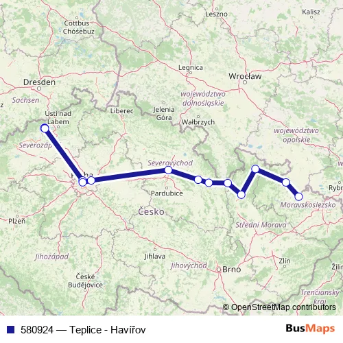 The first stop of the 580924 bus route is Teplice, Celní and the last stop is Opava, Nákladní-Witzenmann. 580924 (Teplice - Havířov) is operational during everyday.