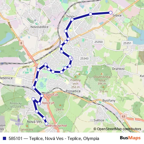The first stop of the 585101 trolleybus route is Teplice, Nová Ves and the last stop is Teplice, Olympia. 585101 (Teplice, Nová Ves - Teplice, Olympia) is operational during everyday.