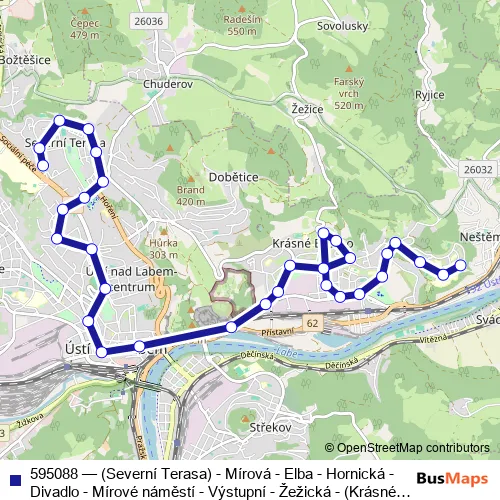 The first stop of the 595088 trolleybus route is Ústí nad Labem,Severní Terasa and the last stop is Ústí nad Labem,Pod Vyhlídkou. 595088 ((Severní Terasa) - Mírová - Elba - Hornická - Divadlo - Mírové náměstí - Výstupní - Žežická - (Krásné Březno - Pod Vyhlídkou)) is operational during everyday.