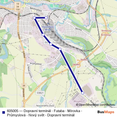 The first stop of the 605005 bus route is Havlíčkův Brod,Dopravní terminál and the last stop is Havlíčkův Brod,Futaba. 605005 (Dopravní terminál - Futaba - Mírovka - Průmyslová - Nový svět - Dopravní terminál) is operational during everyday.