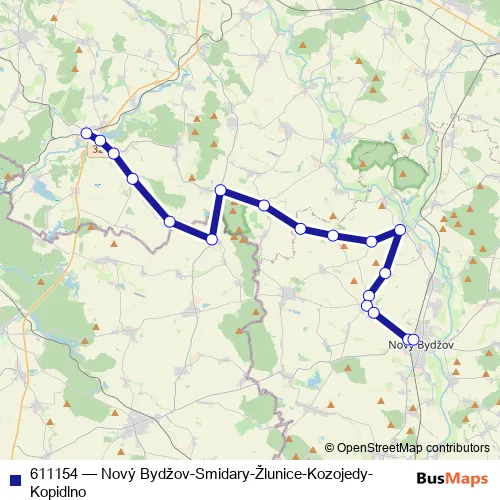 The first stop of the 611154 bus route is Kopidlno,žel.st. and the last stop is Nový Bydžov,Terminál Hd. 611154 (Nový Bydžov-Smidary-Žlunice-Kozojedy-Kopidlno) is operational during on weekdays.