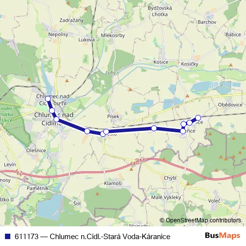 Click here to view the nearest 611173 - Chlumec n.Cidl.-Stará Voda-Káranice bus stop.