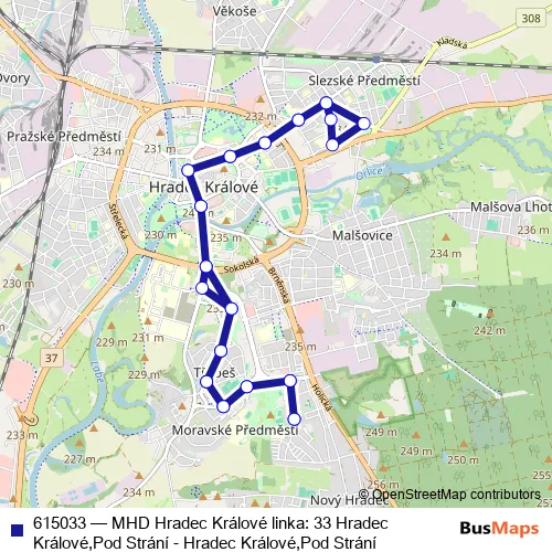 The first stop of the 615033 bus route is Hradec Králové,Pod Strání and the last stop is Hradec Králové,Pod Strání. 615033 (MHD Hradec Králové linka: 33 Hradec Králové,Pod Strání - Hradec Králové,Pod Strání) is operational during on weekends.