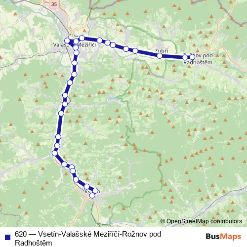 The first stop of the 620 bus route is Rožnov pod Radhoštěm, autobusová stanice and the last stop is Vsetín, autobusové nádraží. 620 (Vsetín-Valašské Meziříčí-Rožnov pod Radhoštěm) is operational during everyday.