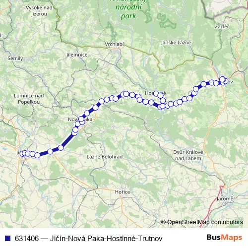 The first stop of the 631406 bus route is Jičín,aut.st. and the last stop is Trutnov,aut.st.. 631406 (Jičín-Nová Paka-Hostinné-Trutnov) is operational during on weekdays.