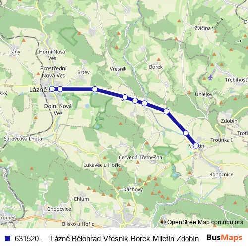 Click here to view the nearest 631520 - Lázně Bělohrad-Vřesník-Borek-Miletín-Zdobín bus stop.