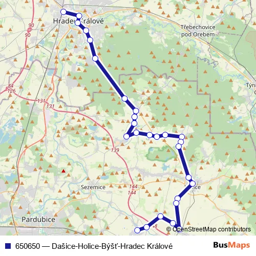 The first stop of the 650650 bus route is Hradec Králové,Terminál Hd and the last stop is Holice,aut.nádr.. 650650 (Dašice-Holice-Býšť-Hradec Králové) is operational during everyday.