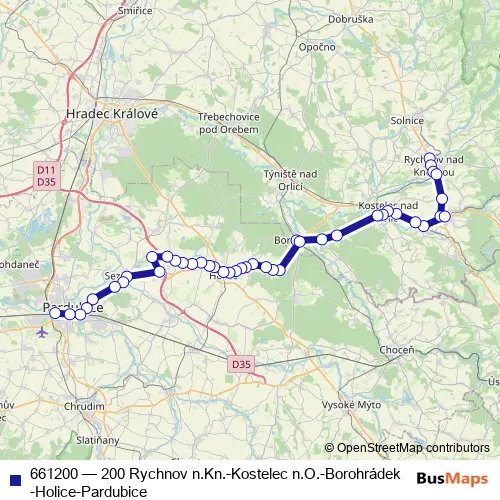 The first stop of the 661200 bus route is Rychnov n.Kněž.,nemocnice and the last stop is Pardubice,Hlavní nádraží. 661200 (200 Rychnov n.Kn.-Kostelec n.O.-Borohrádek-Holice-Pardubice) is operational during everyday.